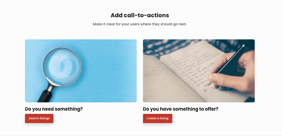 Features sections are highly visual. This example encourages buyers to find listings and sellers to create them. Each row is a unique Block. Both Blocks include an image, title, text, and call to action button. This layout alternates where media and text information appear.